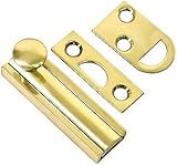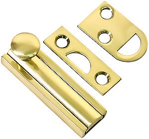 Solid brass surface bolt measuring 2" in length and 5/8" in width, including extended and mortise strikes. This bolt has a throw of 7/16".